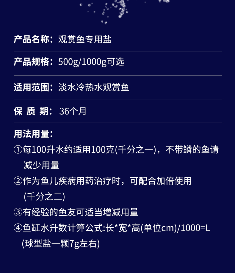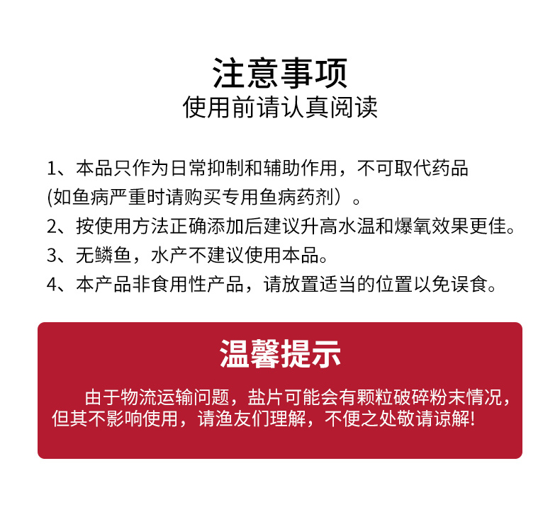 ①每100升水約適用100克(千分之一),不帶鱗的魚請(qǐng)減少用量